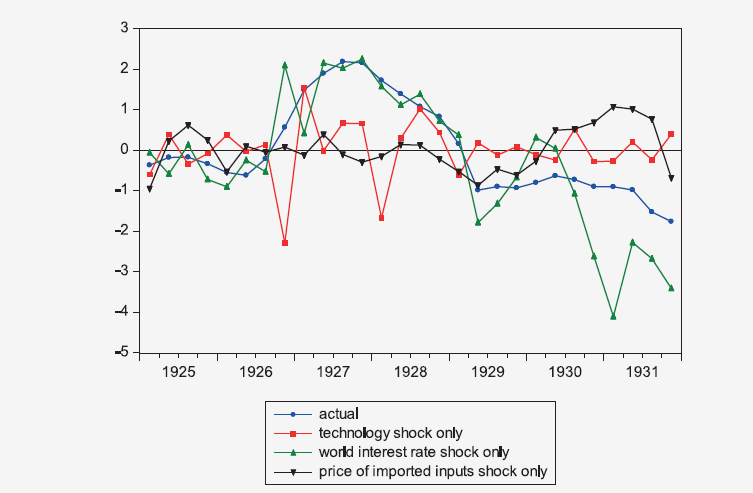 作者采用1925-1929年之间魏玛共和国的宏观数据对模型进行参数校准,并使用个人消费、进口投入品和资本账户-GDP之比的季度数据来确定模型当中的冲击大小。其中,资本账户-GDP之比代表着资本净流入的水平。接下来,技术、世界利率水平和进口投入品价格的冲击再被分别加入到模型当中,以确定究竟是哪一个因素真正影响资本流入的情况。结果表明,世界利率水平的冲击对于资本流动的影响是最主要的。世界利率水平反映了外国投资者对于德国债务违约风险的预期,而这种预期则和德国的赔款计划的变更以及国内政治局势的变动紧密联系。