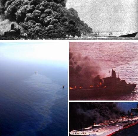 科威特漏油事故原油泄漏量:(136万至150万吨)迄今最严重的原油泄漏事故发生在第一次海湾战争时期的科威特南部。1991年1月晚些时候,萨达姆下令从科威特撤退的伊拉克军队打开石油管道、油井甚至停泊在港口的油轮的阀门,试图为避免军事失败做最后的挣扎。