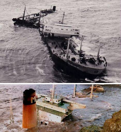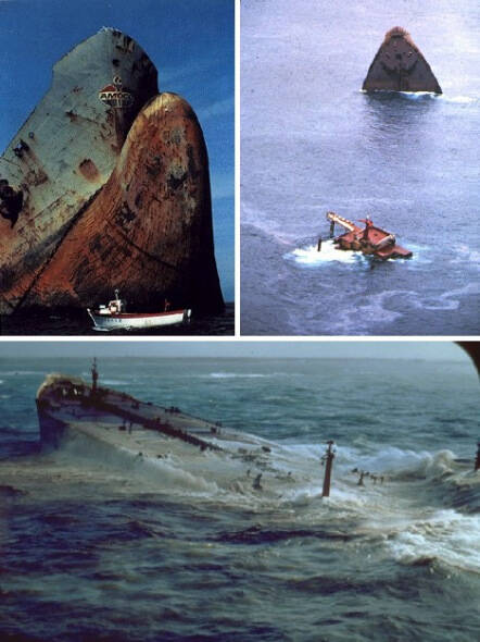 “阿莫戈-卡迪兹”号事故(原油泄漏量:22.3万吨)“M/T天堂”号的姐妹船“阿莫戈-卡迪兹”号因1978年3月16日撞上法国布列塔尼海岸附近的波特萨尔岩礁,对环境造成严重破坏而臭名昭著。当时,“阿莫戈-卡迪兹”号满载160.45万桶原油,因方向舵被一个巨浪损坏导致失控,撞上90英尺(约合27.4米)深的岩礁,使得这艘油轮断为两截,迅速沉入海底,到那时,船上全部的原油全部泄漏到海里。