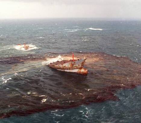 “托利卡尼翁”号事故(原油泄漏量:12.3万吨)1967年3月18日,利比里亚籍超级油轮“托利卡尼翁”号(Torrey Canyon)触礁失事或标志着现代极其严重的原油泄漏事故的开始。在英国康沃尔郡锡利群岛附近海域搁浅以后,“托利卡尼翁”号泄漏了3800万加仑(约合12.3万吨)的原油,最后断为两截,沉入海底。事后调查发现,船长为了尽快到达目的地,擅自改变航道,酿成苦果。