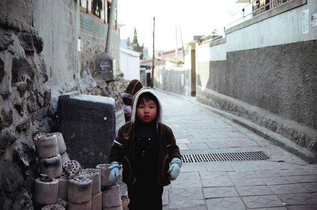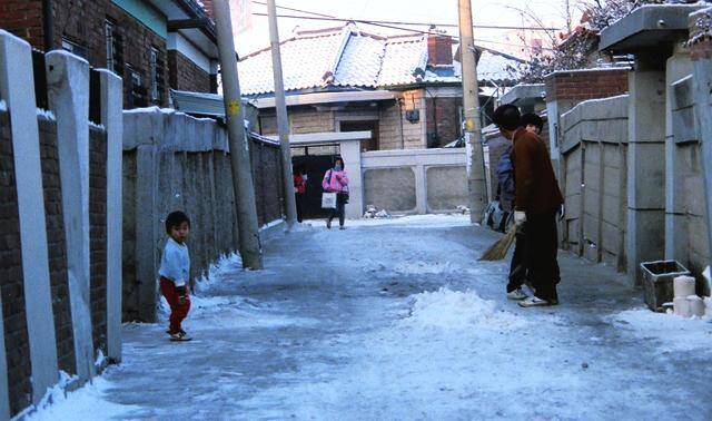 小巷中的小孩。那时候的汉城也是烧的蜂窝煤。