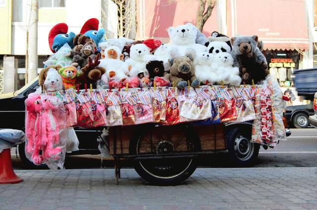 这些照片是美国学者David G.1985年在汉城拍摄。那时候的汉城街道上,还经常可以看到这样的卖小玩意的小推车。