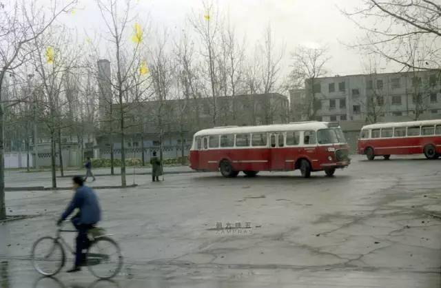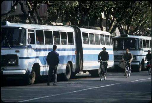 停靠在路边的老式公交车,和自行车则是80年代的主要出行工具。